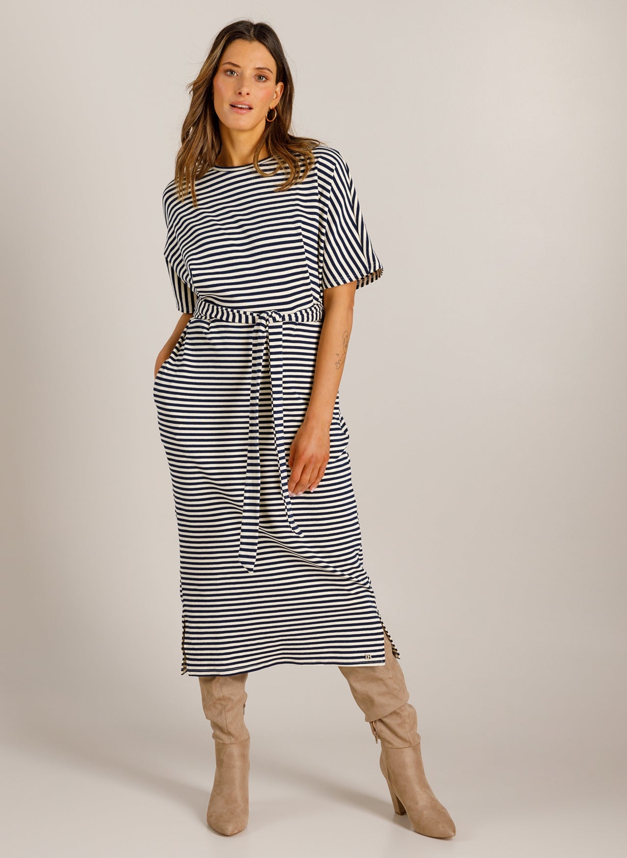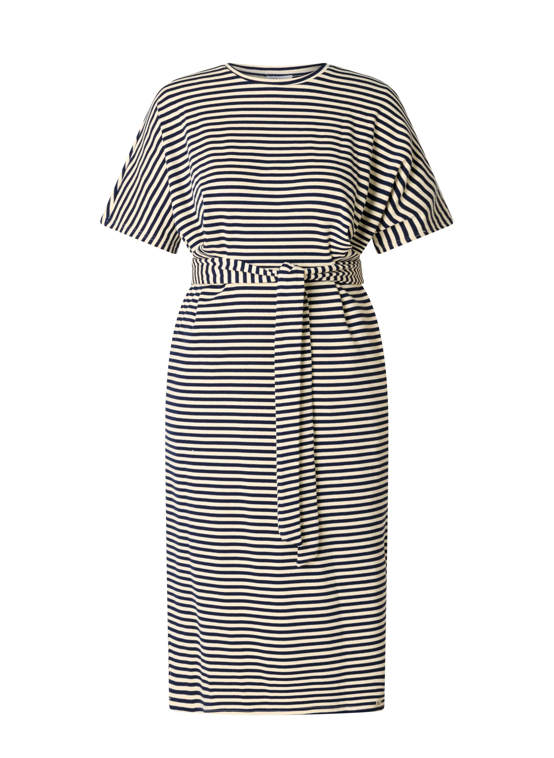 Ivy Beau jurk gestreept offwhite met donkerblauw model Vivi night blue
